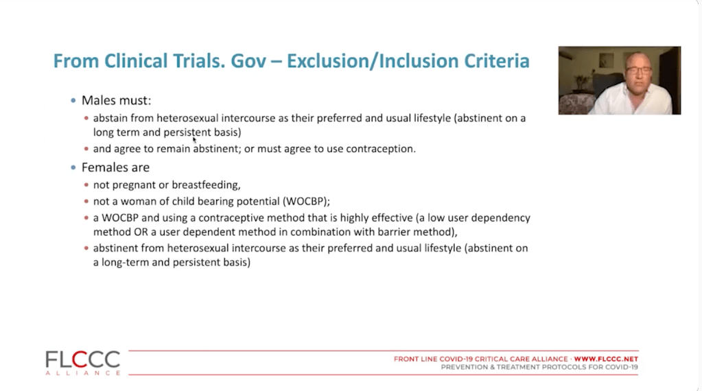 He continues, “Keep in mind, if it was so safe, I would call out some of inclusion/exclusion criteria. If you look at this, males must abstain from heterosexual intercourse as their preferred and usual lifestyle, abstinent on a long term and persistent basis…this is a tough sell to a good portion of the US population.”