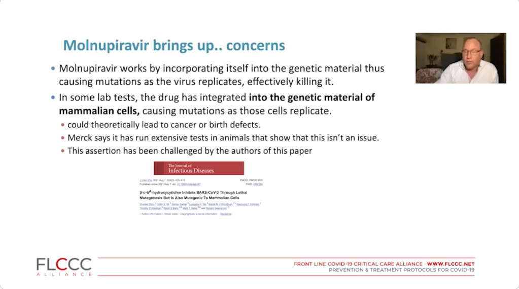 In a recent FLCCC update video from October 6, Dr. Pierre Kory, a clinical physician and advocate of the use of ivermectin as one treatment to defeat Covid in its early stages (see studies) says that though he is hopeful on the use of any new drug to defeat Covid, he is cautious about what he’s seen so far about molnupiravir.